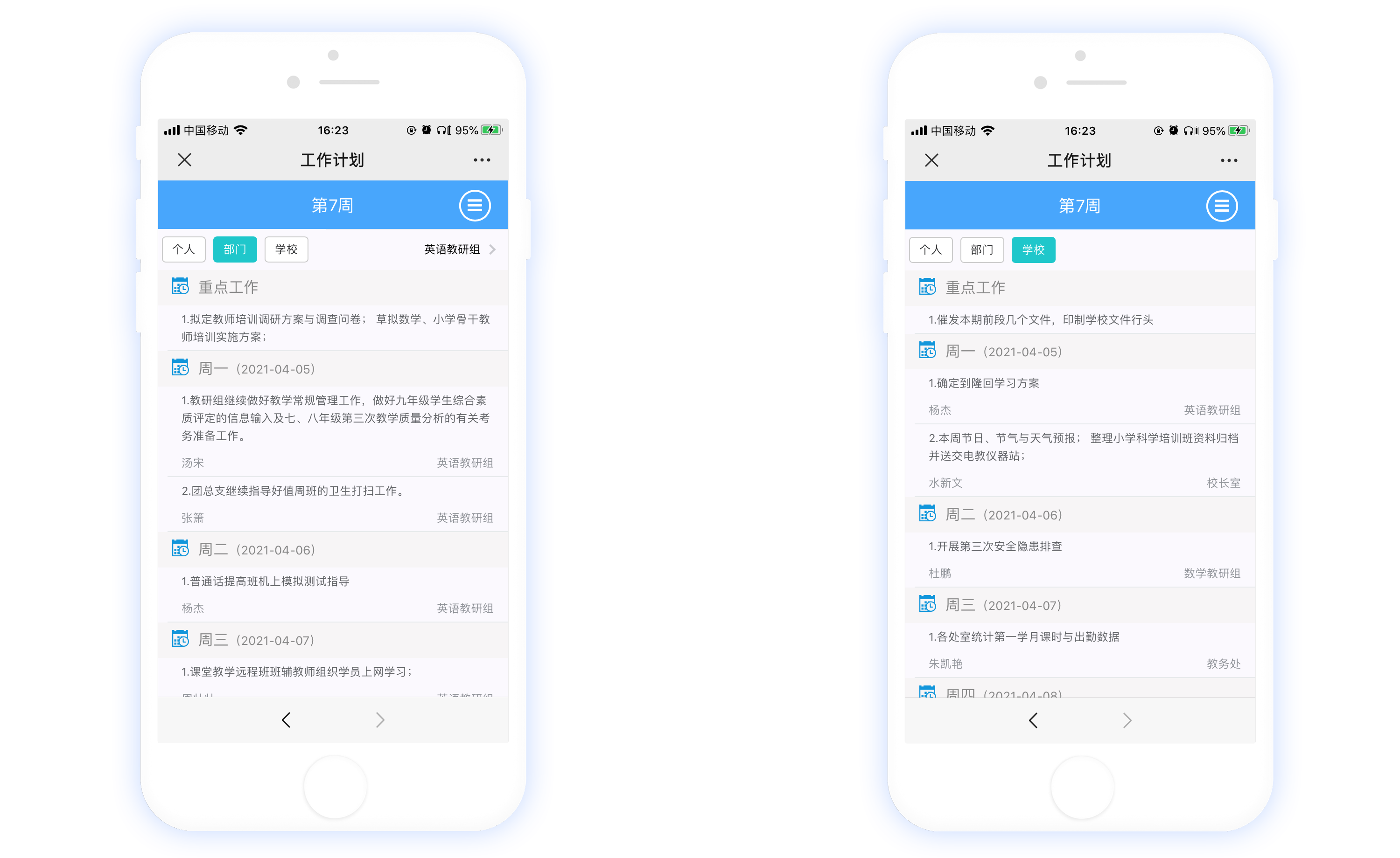 老(lǎo)師(s↕>hī)在日(rì)常上(shàng)下(xià)班時(shí)隻要(yào)利¶>用(yòng)手機(jī)進行(xíng)打₩÷卡既能(néng)實現(xiàn)日(rì)常的(<>≈de)考勤,效率提高(gāo),體(tǐ)驗感更好(hǎo)支持個 >♠✔(gè)人(rén)、部門(mén)、學校(xiào)¶★σ三級計(jì)劃的(de)制(zhì)定、上(shàng)報(bào)≥€ §、采用(yòng)以及發布支持同步到(dào)個(gè•$$≠)人(rén)日(rì)程中。